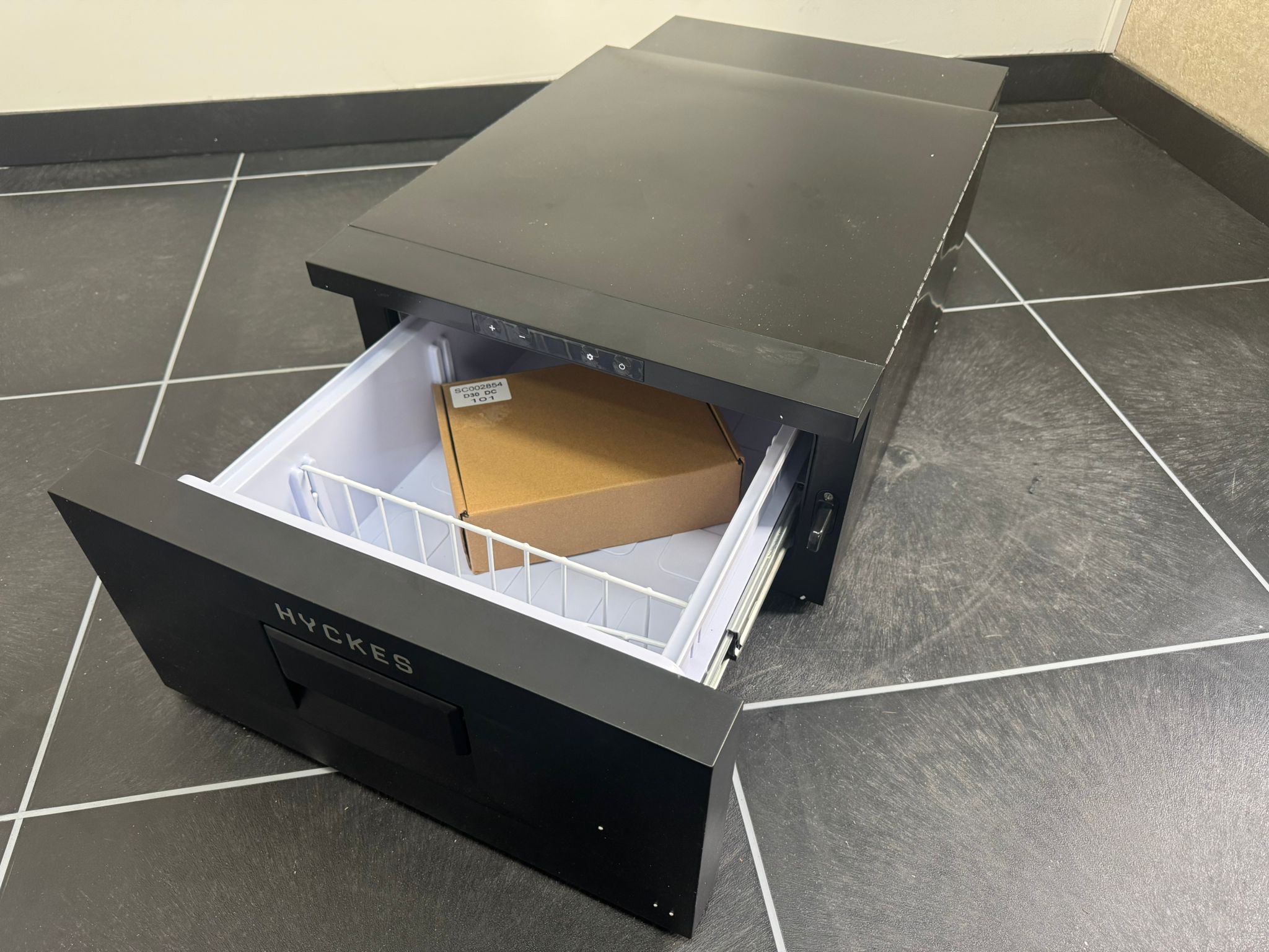 Easily operate the refrigerator drawer via the digital control panel. The display shows the set or current temperature of the refrigerator compartment and gives access to the advanced settings. Download the Hyckes app on a phone or tablet to operate the cooling drawer from the comfort of your armchair. The app gives your mobile device access to all the functions of the cooling drawer via Bluetooth. Thanks to the built in LED lighting that turns on automatically as soon as you open the drawer, the contents of the device are always clearly visible. If desired, the drawer can be completely removable. Use the optional mounting frame to easily and tightly install the cooling drawer into any vehicle.